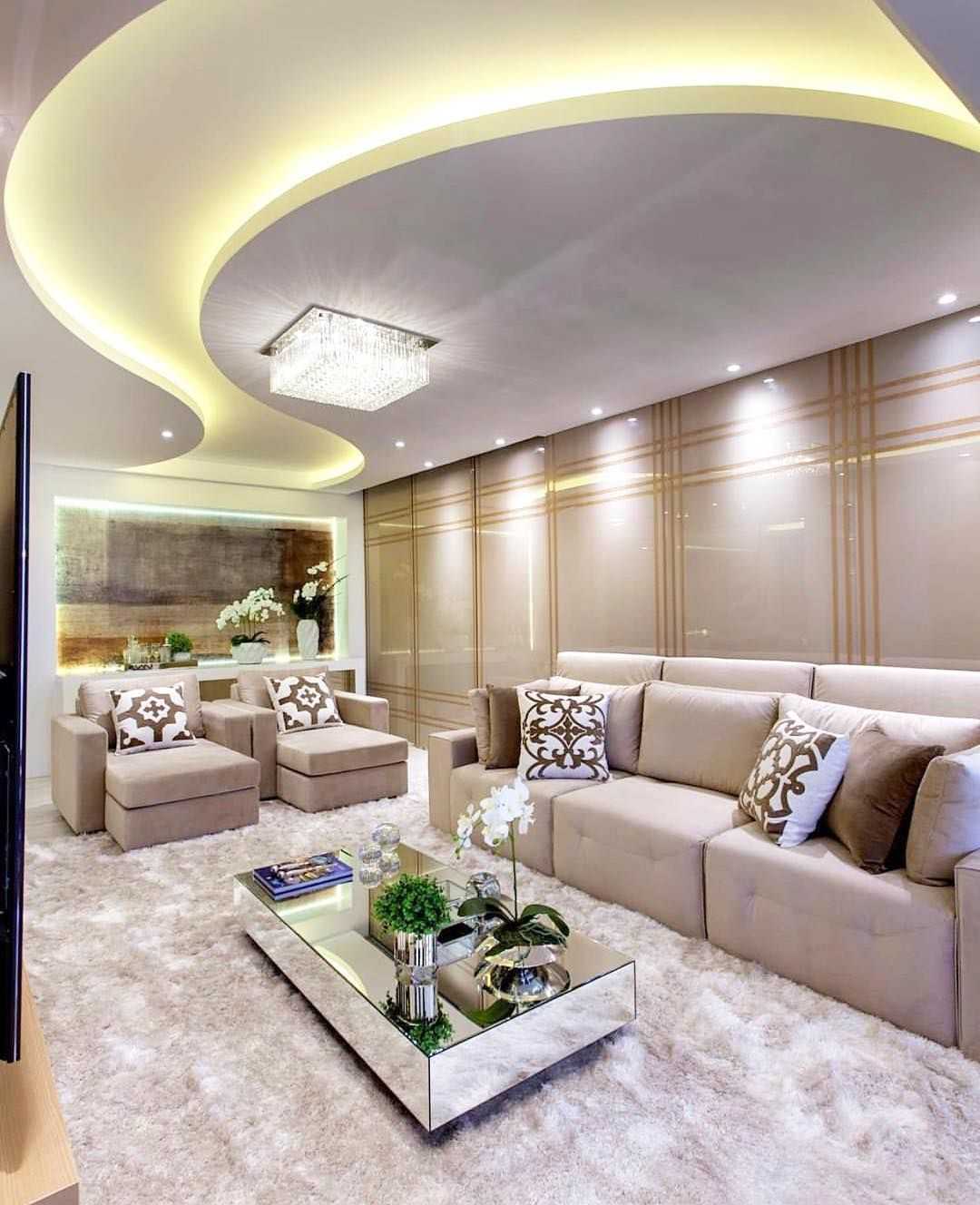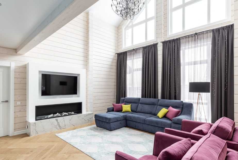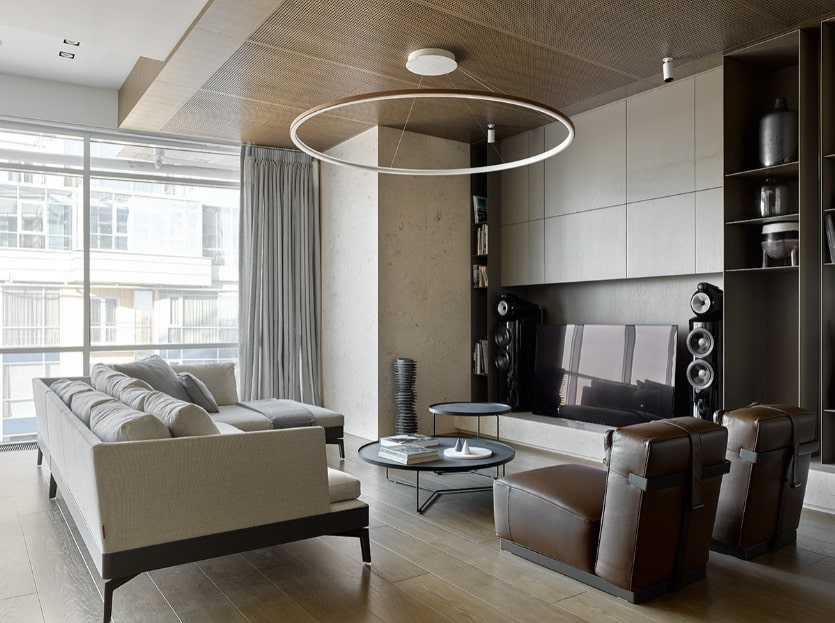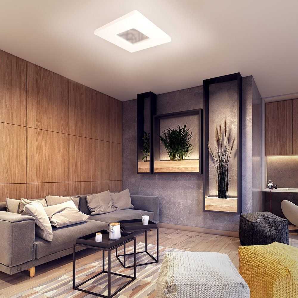 В дизайне гостиной потолок играет ключевую роль. Для отделки можно использовать самые простые варианты: