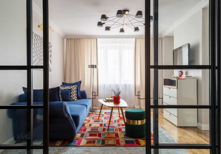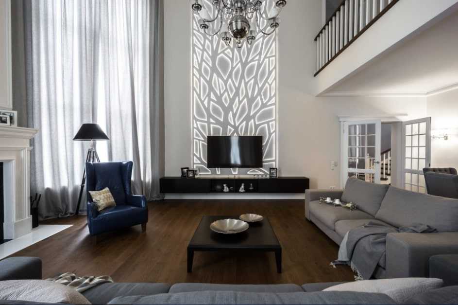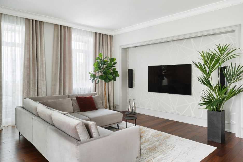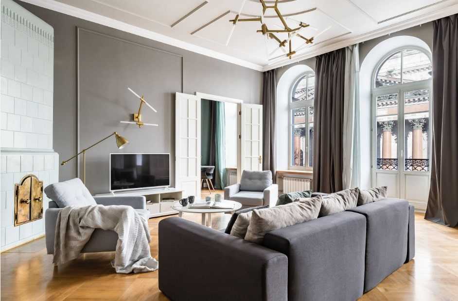 Двери играют немалую роль в дизайне гостиной: они должны подходить по цвету, материалу и дизайну. Для светлой комнаты рекомендуется использовать двери в белых, бежевых и светло-серых тонах.