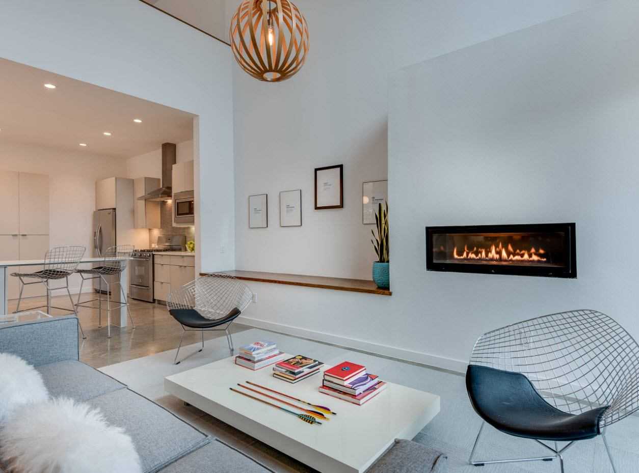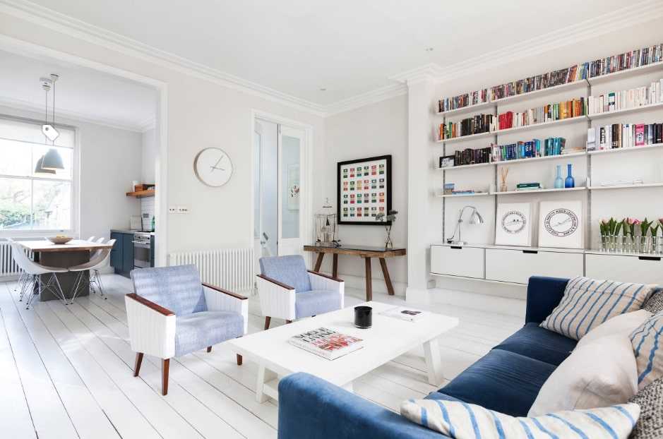 Гостиная в скандинавском стиле выглядит по-особенному светлой. Здесь преобладают белые тона, делая помещение свежим и ультрамодным.