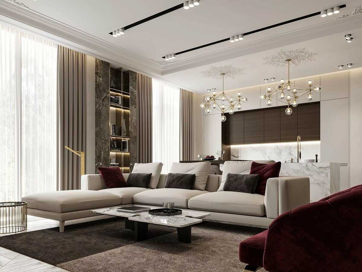 - Во-первых, гостиная зачастую наиболее большое и светлое помещение во всей квартире, а как мы уже говорили выше бордовый нуждается и в пространстве и в свете.