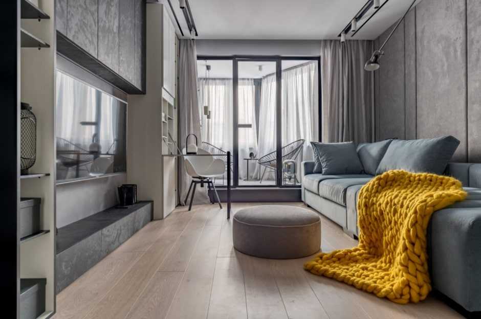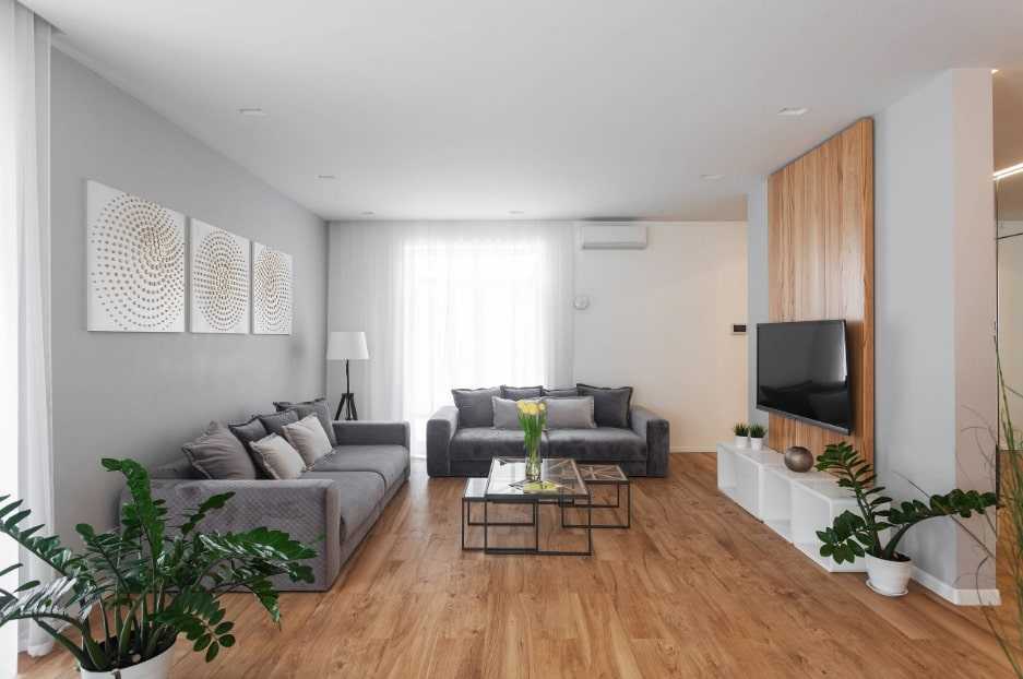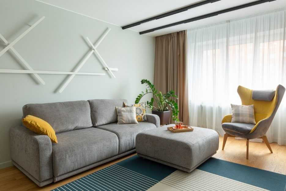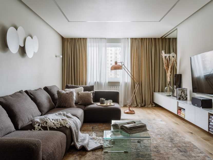 В 2021 году было модным зонировать пространство используя стеллажи и диваны. Сейчас эту идею лучше отложить до новых времен, так как метод забирает пространство, которого и так порой не хватает. В качестве альтернативы в дизайне гостиной можно использовать слоение двух материалов. Это обеспечивает дополнительный уровень комфорта под ногами, одновременно очерчивает границы определенных зон и добавляет больше уюта.