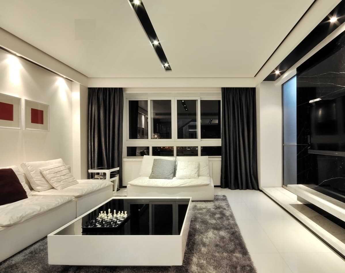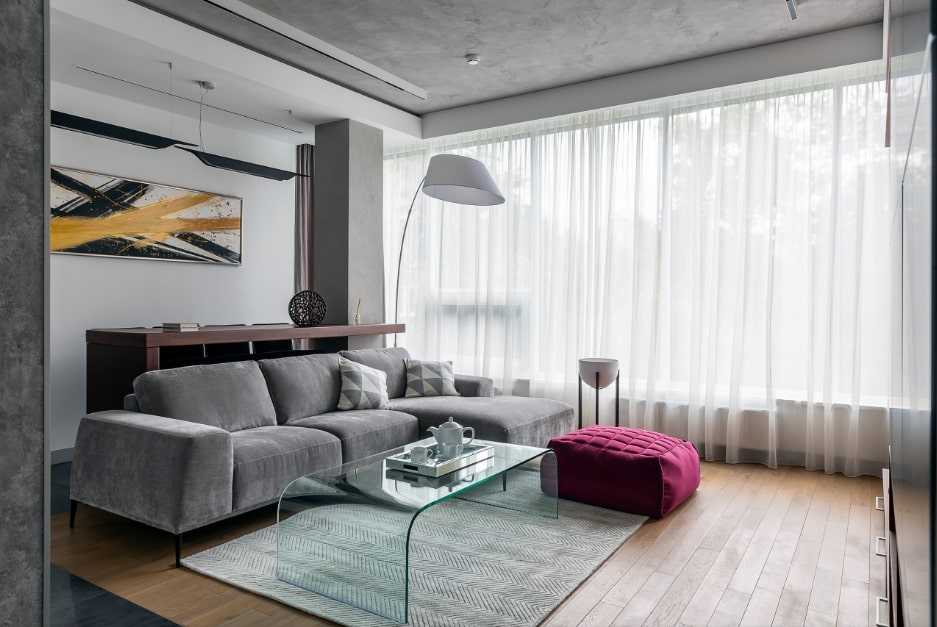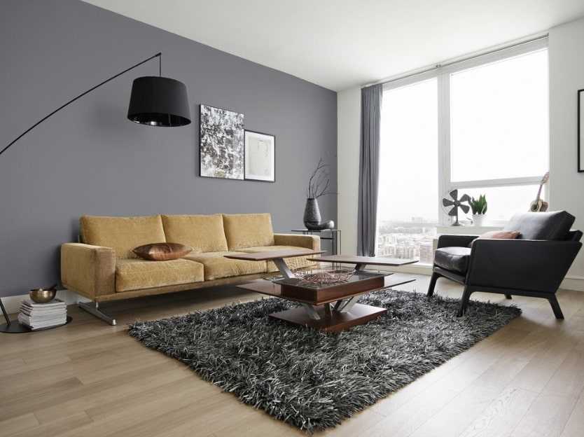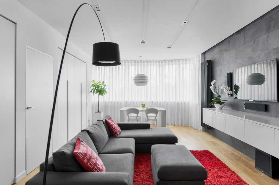 В стиле минимализм, два цвета – это базовая основа и цветовой акцент (можно использовать не только яркий оттенки, но и глубокие). Самые подходящие цвета для оформления гостиной в стиле минимализм – черный, серый и белый. Для цветовых акцентов прекрасно подходят: желтый, голубой и красный.