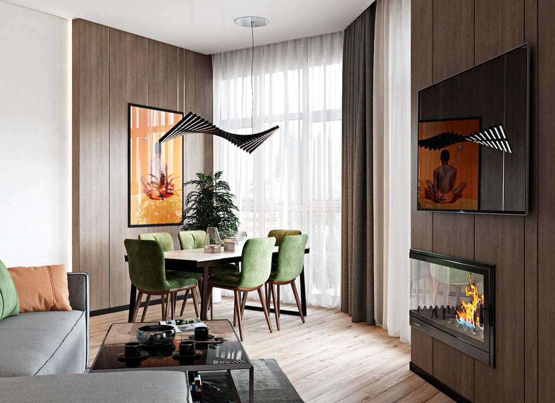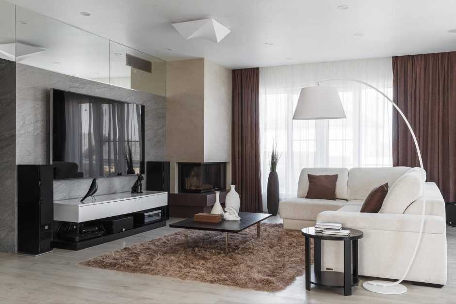 - из-за тесноты камином «жертвуют», его часть пространства отдают зоне с большим телевизором (напротив него также размещают гостевой диван с креслами, присоединяя к композиции компактный журнальный столик).