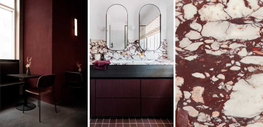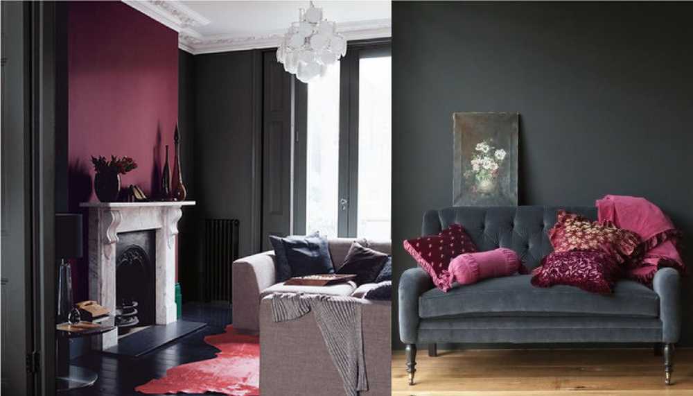 Бордовый с красным — это смелая комбинация двух ярких цветов, которые дополняют друг друга, создавая чрезвычайно динамичный дуэт. В этом случае необходим нейтральный успокаивающий базовый цвет, например, пепельный или кремовый.