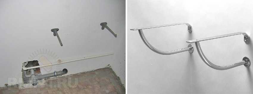 При отсутствии ножки крепление раковины будет испытывать динамические нагрузки, поэтому двумя шпильками здесь не обойтись. Устанавливают кувшинку на специальные кронштейны. Это могут быть как простейшие уголки из стали, так и вычурные скобы с хромированным покрытием. Есть разновидность раковин с двумя круглыми каналами внутри бортов, которыми чаша надевается на две трубы, жёстко закреплённые к стене.