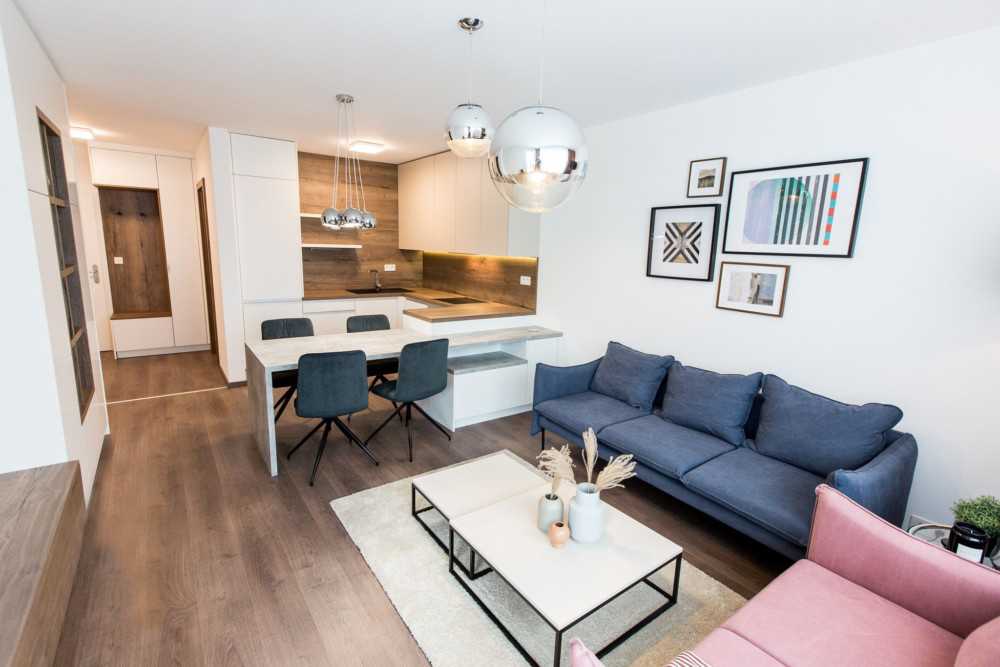 Вы мечтаете о пушистом мягком коврике, по которому приятно ходить босиком? Вас отталкивает грубый, минималистичный интерьер гостиной? Не можете представить себе голый пол рядом с любимым раскладным диваном? Прохладно? Так что купите ковер своей мечты, подобрав цвет и стиль остальному интерьеру. Однако выбирайте его размер так, чтобы он покрывал только пол в гостиной — с диваном и креслами. На кухне потребуется поверхность, которую при необходимости легко очистить — керамическая плитка или камень.