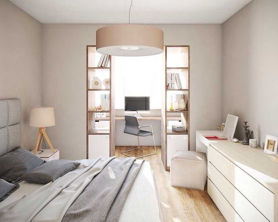 Если объединить комнату с лоджией, можно будет устроить в спальне почти изолированный кабинет. Для зонирования используйте лёгкие перегородки или стеллажи.
