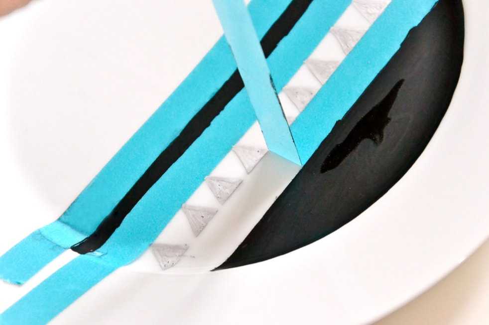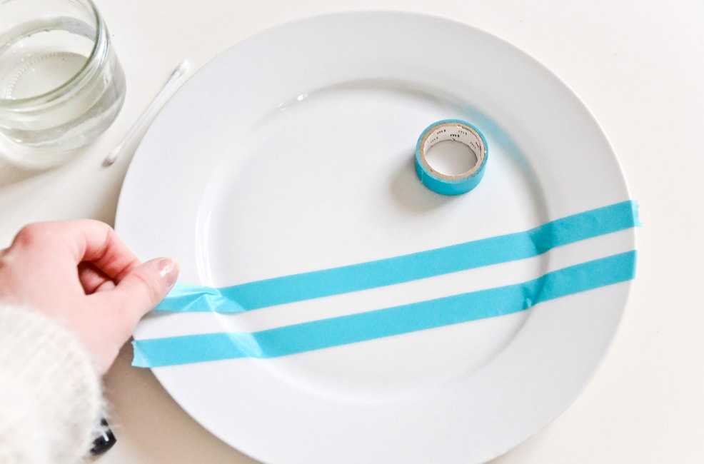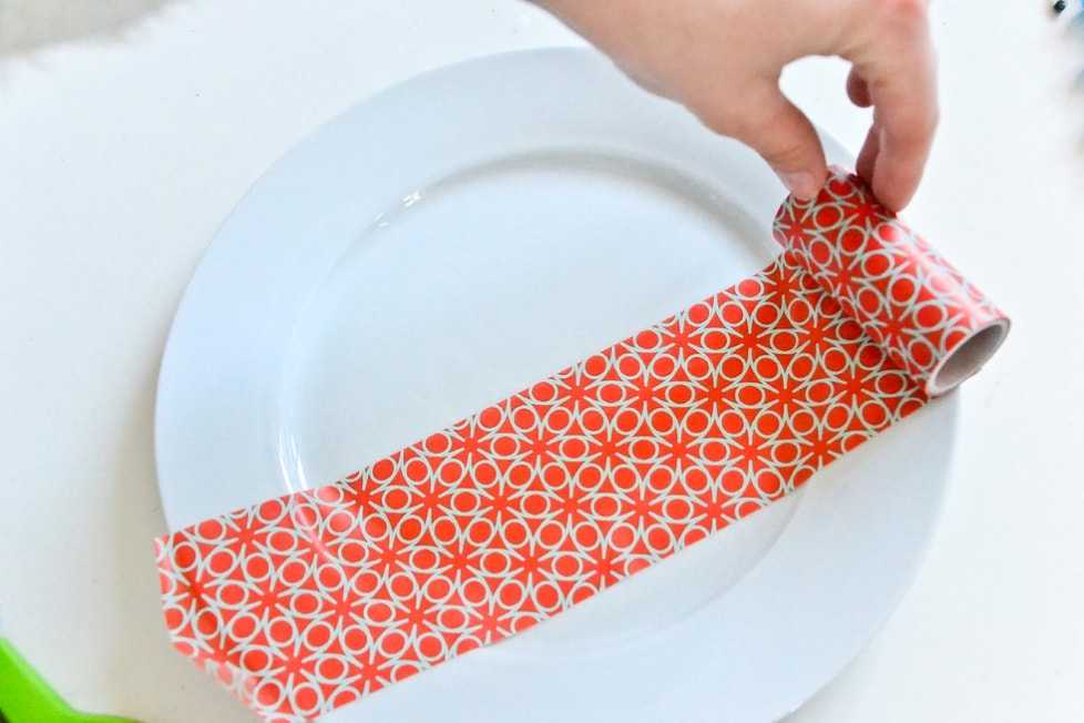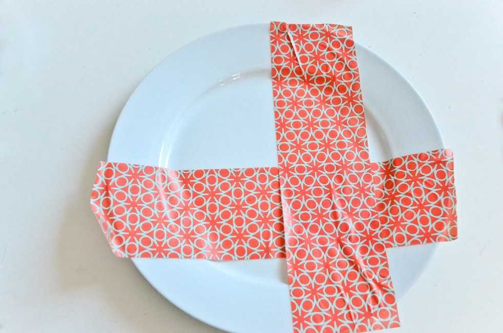 В данном случае используем более широкий скотч. Заклеиваем отрезком практически половину тарелки.