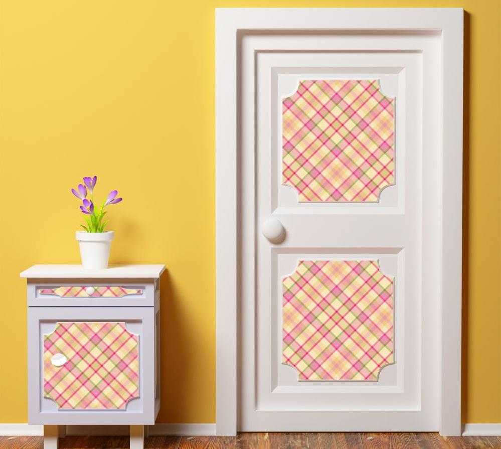 - Декор дверей виниловыми стикерами. Непрозрачная основа позволяет замаскировать дефекты – мелкие трещины, сколы. Под такой декор подойдут филенчатые двери с выраженными вставками.