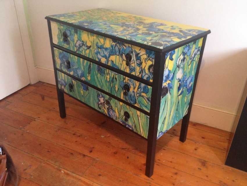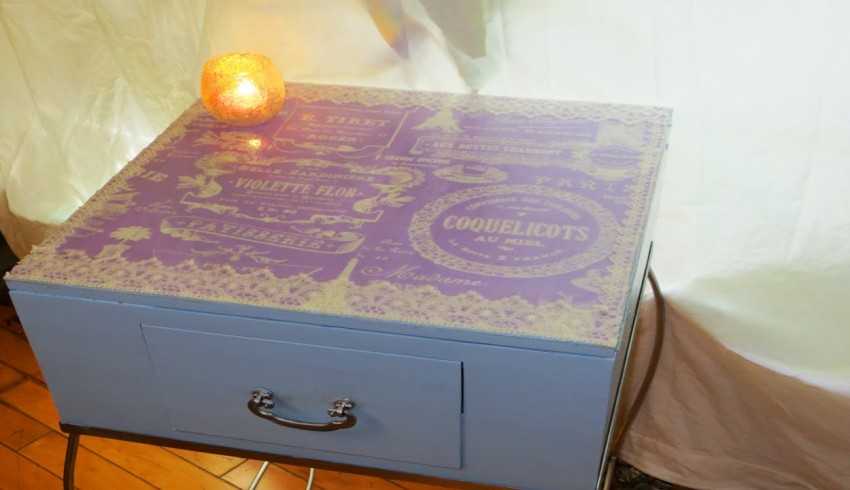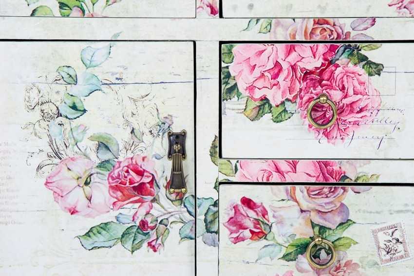 Для создания декора в стиле прованс вам понадобится лишь несколько карточек или красивых салфеток. Нанесите финальные штрихи акриловыми красками, и уникальная мебель готова.