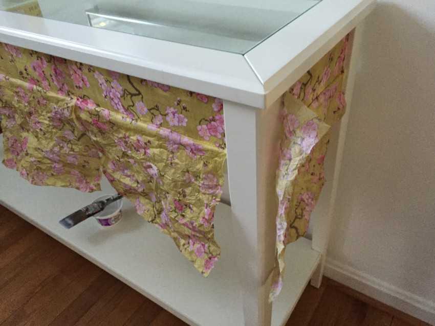 Следующий шаг – подготовка поверхности мебели. Если она лакирована или окрашена, то обработайте её мелкой или средней наждачной бумагой. В зависимости от состояния основы, может потребоваться шпаклевка или мебельный воск для ликвидации трещин, сколов или глубоких потертостей. Подготовив гладкое покрытие, покройте его бесцветным акриловым лаком. Если мебель темная, то лучше перекрасьте её в более светлые тона.