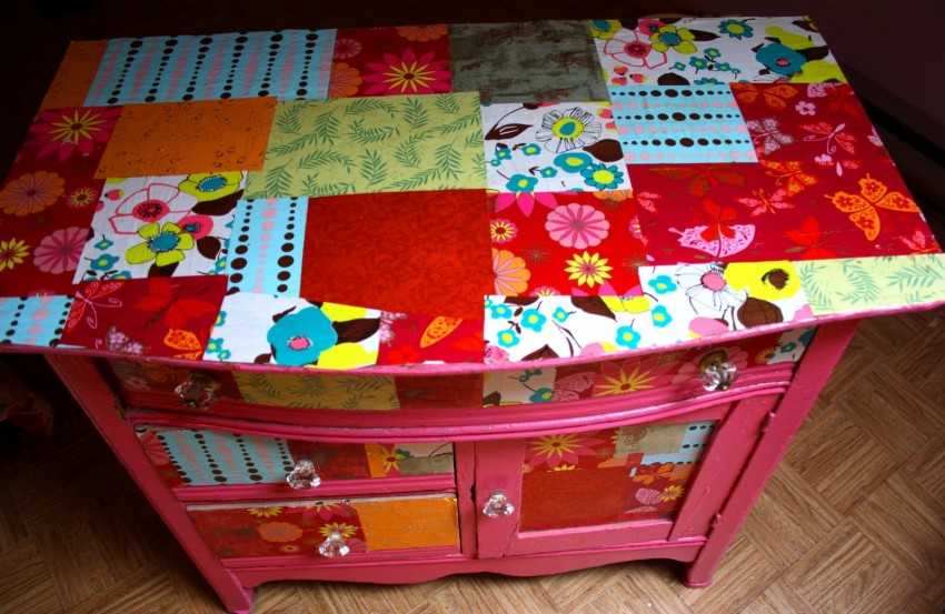 Эта методика называется «декопатч». Для нее используют газеты, картинки из журналов, рисунки на ткани. Чтобы избавиться от четких границ, края бумажных рисунков обрывают. Поверхность полностью заполняется изображениями.