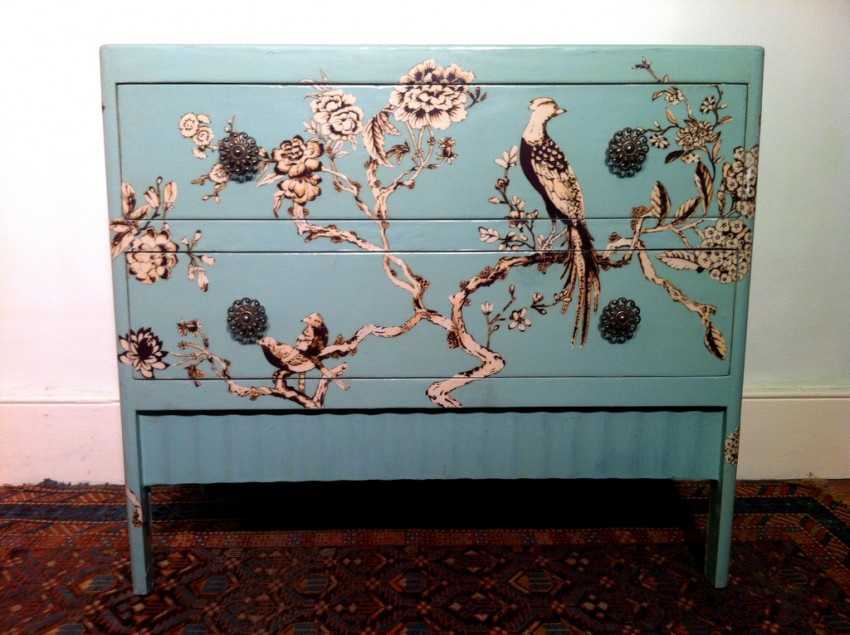 Перед началом работы необходимо подобрать изображение, которое вы желаете нанести на поверхность мебели. Подходят салфетки, рисунки на бумаге или же различные принты на обоях и ткани. Вы можете приобрести готовые картинки, но есть более рациональный путь – распечатайте наиболее удачные варианты на принтере. Такой подход хорош тем, что вам предоставляется действительно обширный выбор красивых принтов в интернете, а также возможность дублировать орнамент. Удобнее всего использовать распечатки, сделанные на лазерном принтере. Такие чернила не растекутся от клея или лака.