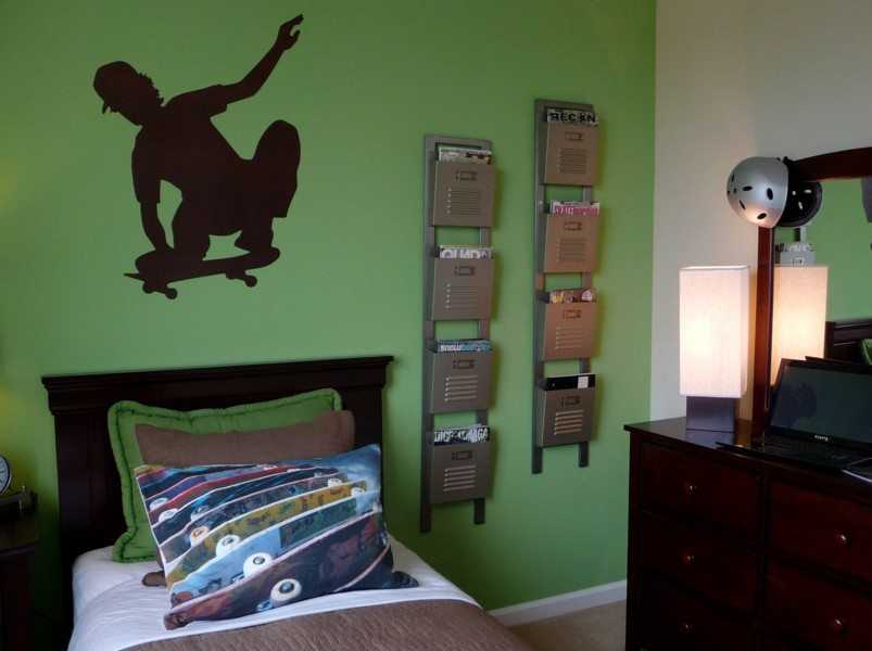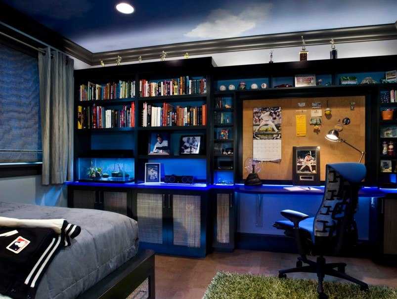 Интересным будет дизайн, основанный на увлечениях, интересах, способностях подростка. Сегодня распространен тематический дизайн подростковых комнат. Для любителей спорта это может быть футбольная, баскетбольная тематика на стенах и в мебели. Производители предлагают мебель с разными спортивными принтами, на заказ выполнят кровать и шкаф любых размеров и форм. На стене можно разместить импровизированные футбольные ворота или фотографии великих игроков. Любителю бокса повесить «грушу» для тренировок. Если ребенок делает успехи в спорте, обязательно выделите полку для его победных трофеев. Медали и кубки – гордость любого мальчишки.