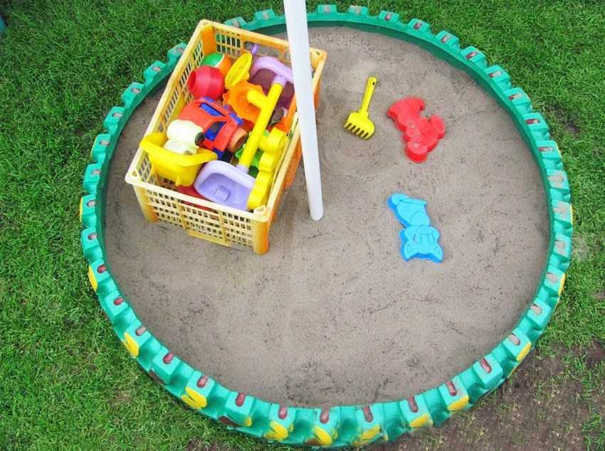 Проще всего из ненужной резины от «большегруза» соорудить небольшую песочницу для одного ребенка. Ее лучше поставить в тени, поскольку «грибок» или навес особо негде расположить. Можно заменить его тканевым тентом или старым пляжным зонтиком, меняя местоположение в зависимости от тени.