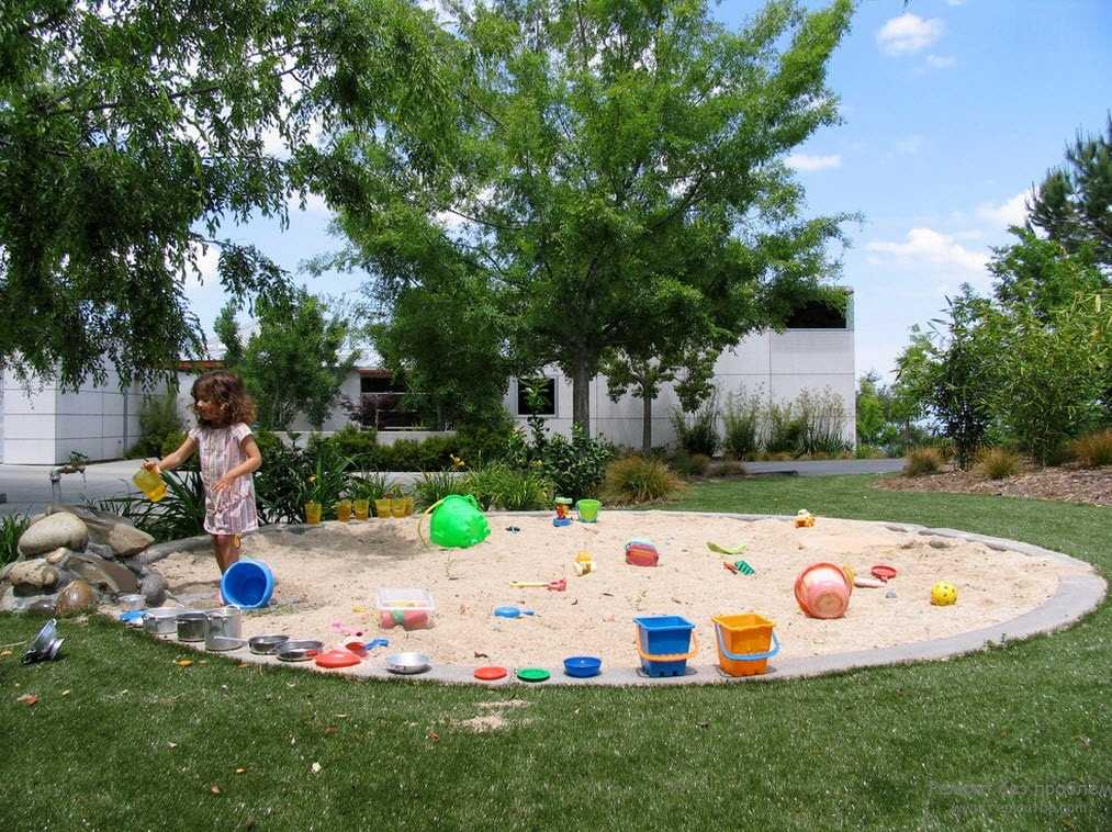 Незаменимый элемент, который должен обязательно присутствовать – песочница. Особенно это актуально для самых маленьких хозяев. Именно там, малыши любят ковыряться, создавать свои шедевры из песка. Игры с песочными фигурками хорошо развивают мелкую моторику у детей. Подрастая, начинающие строители смогут сооружать здесь песочные замки и прочее.