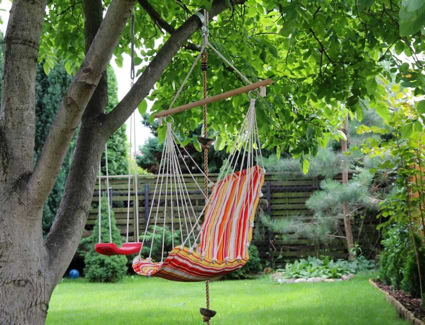 Сделать хорошую качелю можно и своими руками. Для этого тщательно обработайте деревянную доску, которая будет использоваться в качестве сидения или приобретите готовый вариант. Можно также использовать для этого старые покрышки или гамаки.