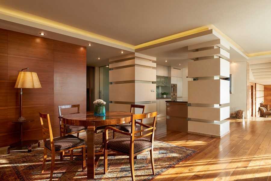 В таком обширном пространстве важно и сохранить «дыхание» интерьера, и сделать так, чтобы не было пустынно. Лучшее решение – современный стиль или неоклассика, сочетание современности и роскоши