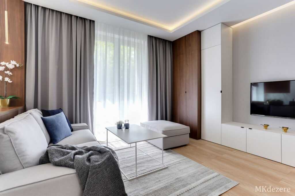 Хорошо, если в основе обустройства гостиной в минималистском стиле лежит, среди прочего использование дерева. Этот материал является элегантным элементом отделки (полы, столешницы), но если вы выбираете шкафы или полки из него, то следует сосредоточиться на простых формах, без украшений. Также нужно знать, что мебель с геометрическими формами создаст ощущение простора в гостиной. Кроме того, в современном дизайне можно наблюдать четкую тенденцию замены кресел и зон отдыха пуфами, а также низкими угловыми диванами с маленькой спинкой.