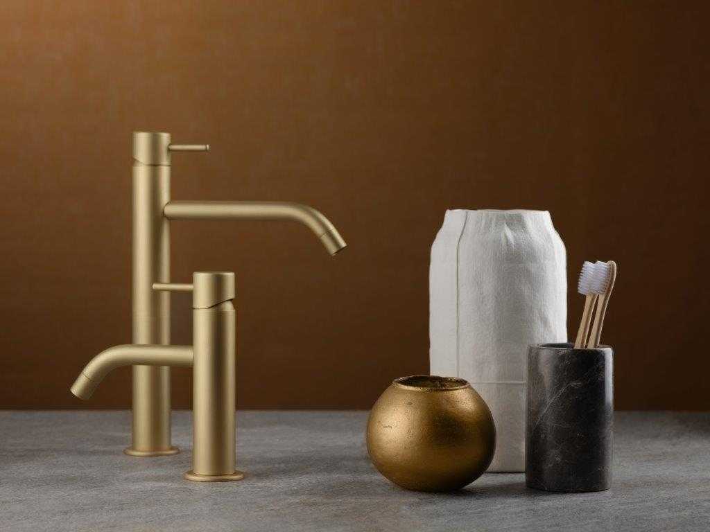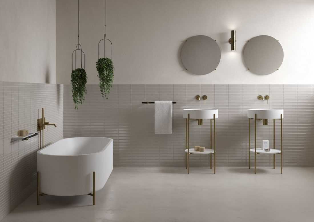 В ванной такие нейтральные, естественные цвета сопровождаются теплыми тонами дерева и металлов — желательно оттенками золота, меди или коричневого. Например, бренд Ritmonio предлагает интересную отделку фурнитуры под названием Frost Champagne.