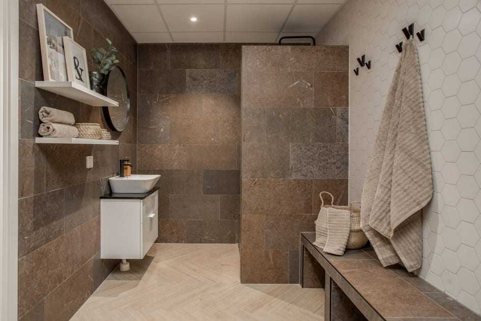 Конечно, чем меньше ванная, тем больше мы ограничиваемся небольшой площадью с характерными элементами (зона умывальника и душа, одна стена или ее фрагмент). Также могут помочь интригующие узоры плитки — часто с необычной трехмерной текстурой.