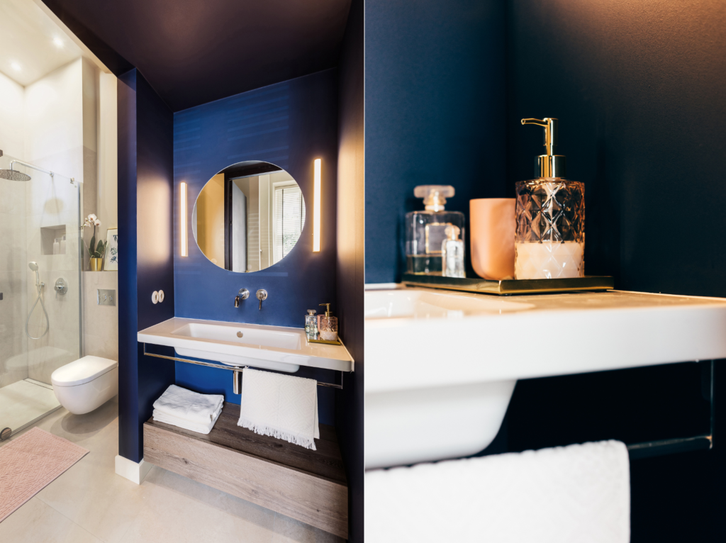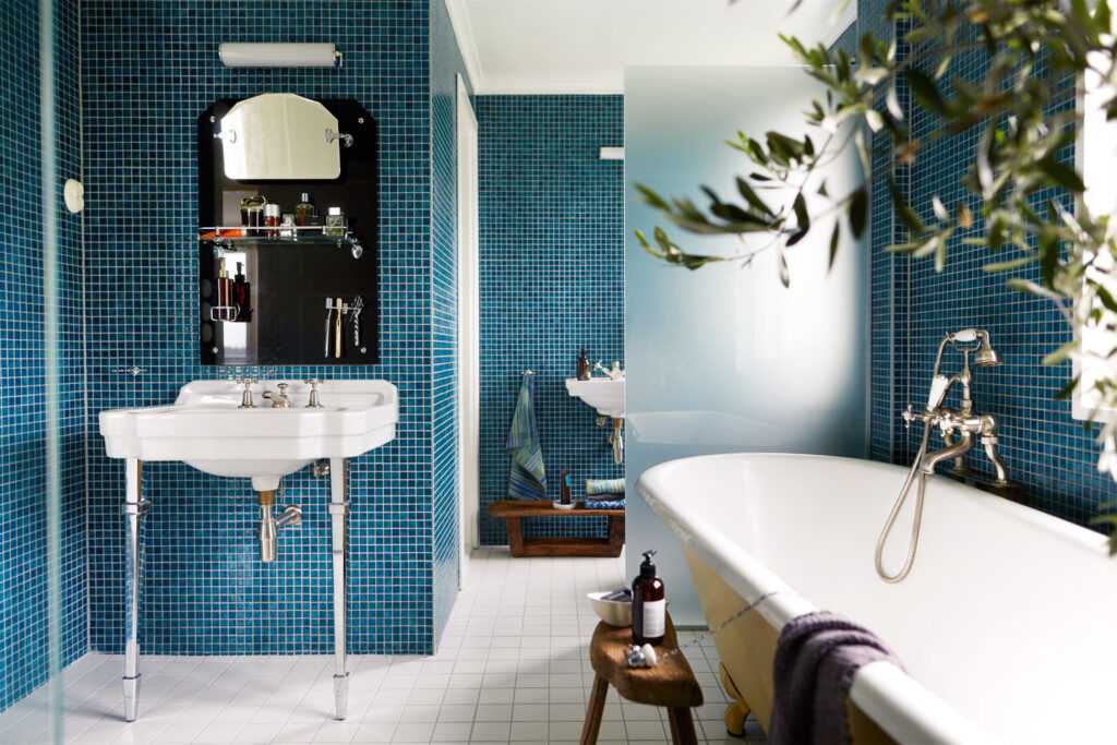 Первый блок содержит синий цвет и его оттенки. Особенно классический синий, обозначенный институтом Pantone как цвет 2020 года. Это оттенок синего цвета, напоминающий небо в сумерках. Этот неподвластный времени цвет призван внести в интерьер тишину и покой. И в ванную комнату он впишется идеально. Подобно морю, оттенки синего ассоциируются с водой, иногда с оттенком зеленого.