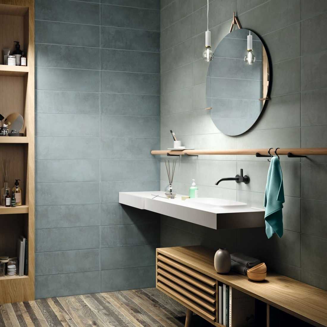 Морские оттенки синего можно найти, например, в коллекции Belike от Iris Ceramica. Серия доступна с отделкой Matt и Lux размером 60 × 20 см. Она сопровождается украшениями размером 20х20 см. Коллекция гибкая, вы можете создавать различные цветовые композиции и сочетать ее с такими материалами, как дерево и бетон.