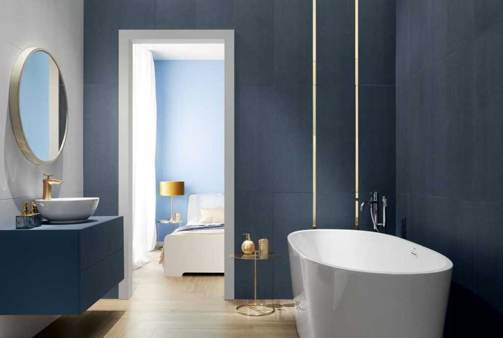 Интересную синюю коллекцию можно найти, например, в предложении бренда Opoczno. Он называется Love You Navy — сочетает в себе глубину темно-синего цвета и атласную поверхность. В серии представлены плитки размером 30 × 90 см, гладкие и структурные — с шевронным узором. Их дополняет двухцветная мозаика в елочку, сочетающую гранат и дерево.