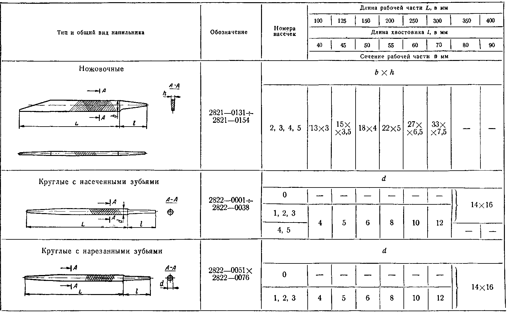– длина рабочей части: от 100 (мм) до 400 (мм) ; – ширина (B/d): от 9 (мм) до 27 (мм) ; – толщина (h/d): от 4.5 (мм) до 13.5 (мм) ; – длина хвостовика: от 40 (мм) до 90 (мм) ; – количество насечек на 10 (мм) для 3-го номера: от 12 до 28 .