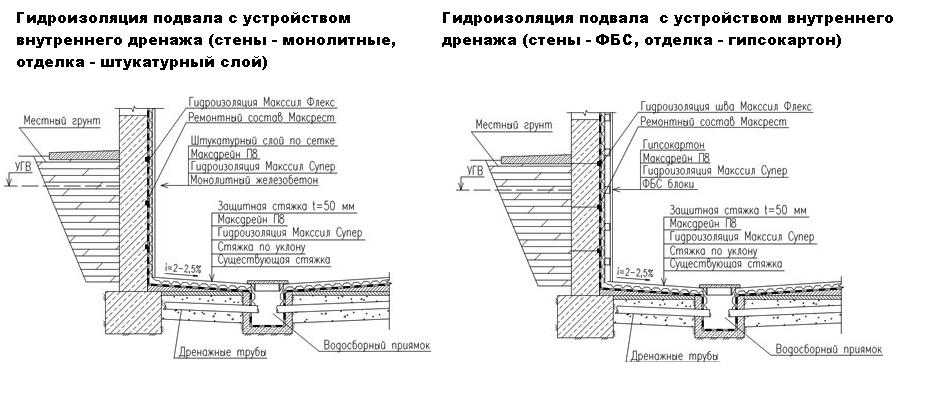 Схема гидроизоляции подвала с обустроенной дренажной системой.