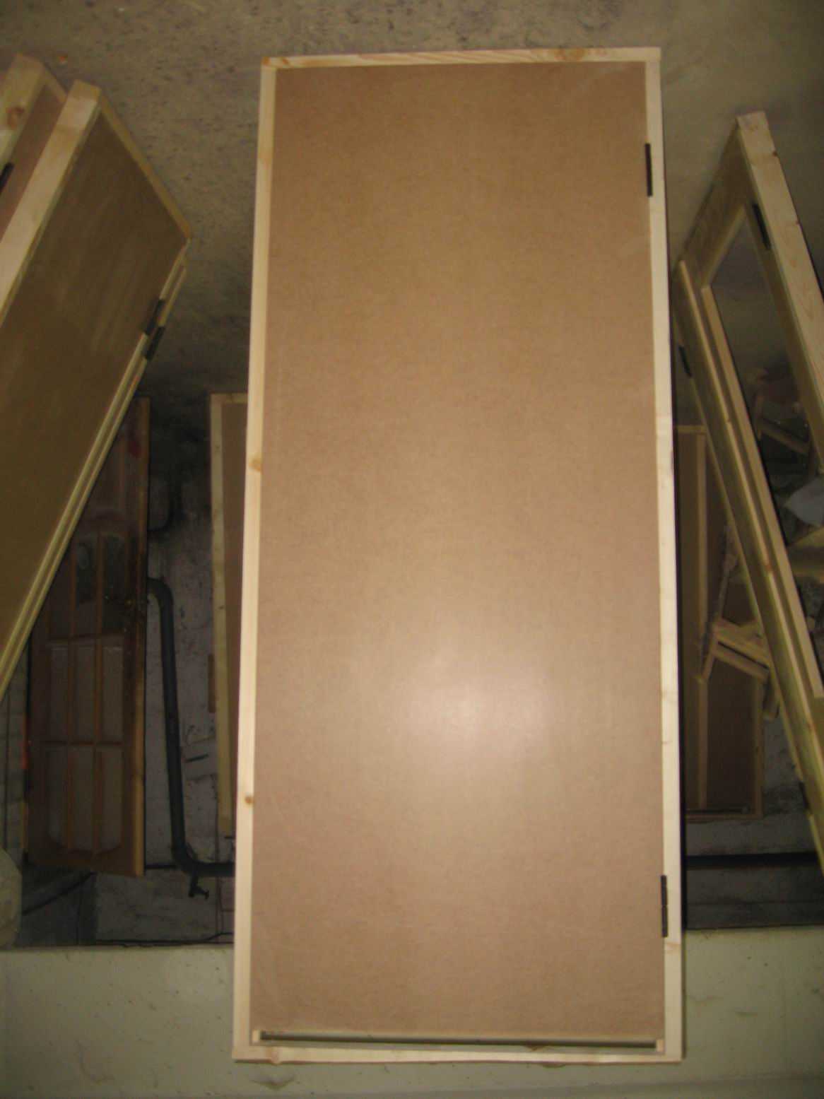 Такая конструкция подойдет для установки в каком-нибудь подсобном помещении, где неважна звуко- и тепло- изоляция. Это каркас из деревянных брусков с несколькими поперечными планками, на который набит фанерный лист подходящего размера.
