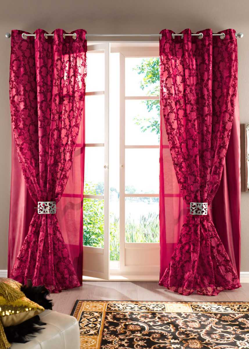 Насыщенный винный цвет гармонично сочетается с золотом. Такое убранство тонко подчеркнёт индивидуальность, вкус и статус хозяина. Варианты драпировки также не дают ограничений в подборе индивидуальных штор. Для этого можно поэкспериментировать со способами зажимов штор.