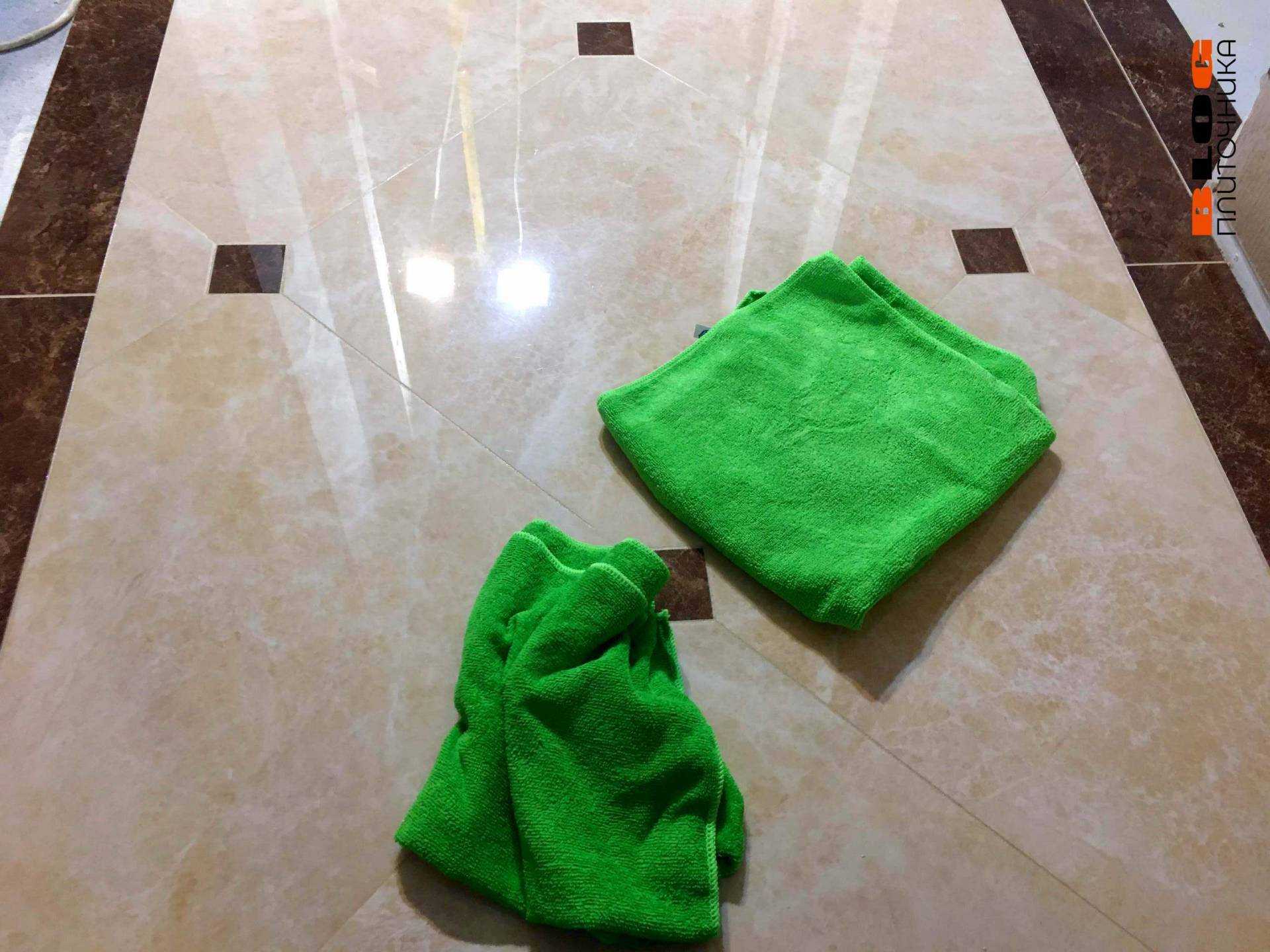 - Удалить излишки краски с поверхности плитки влажной ветошью или губкой.