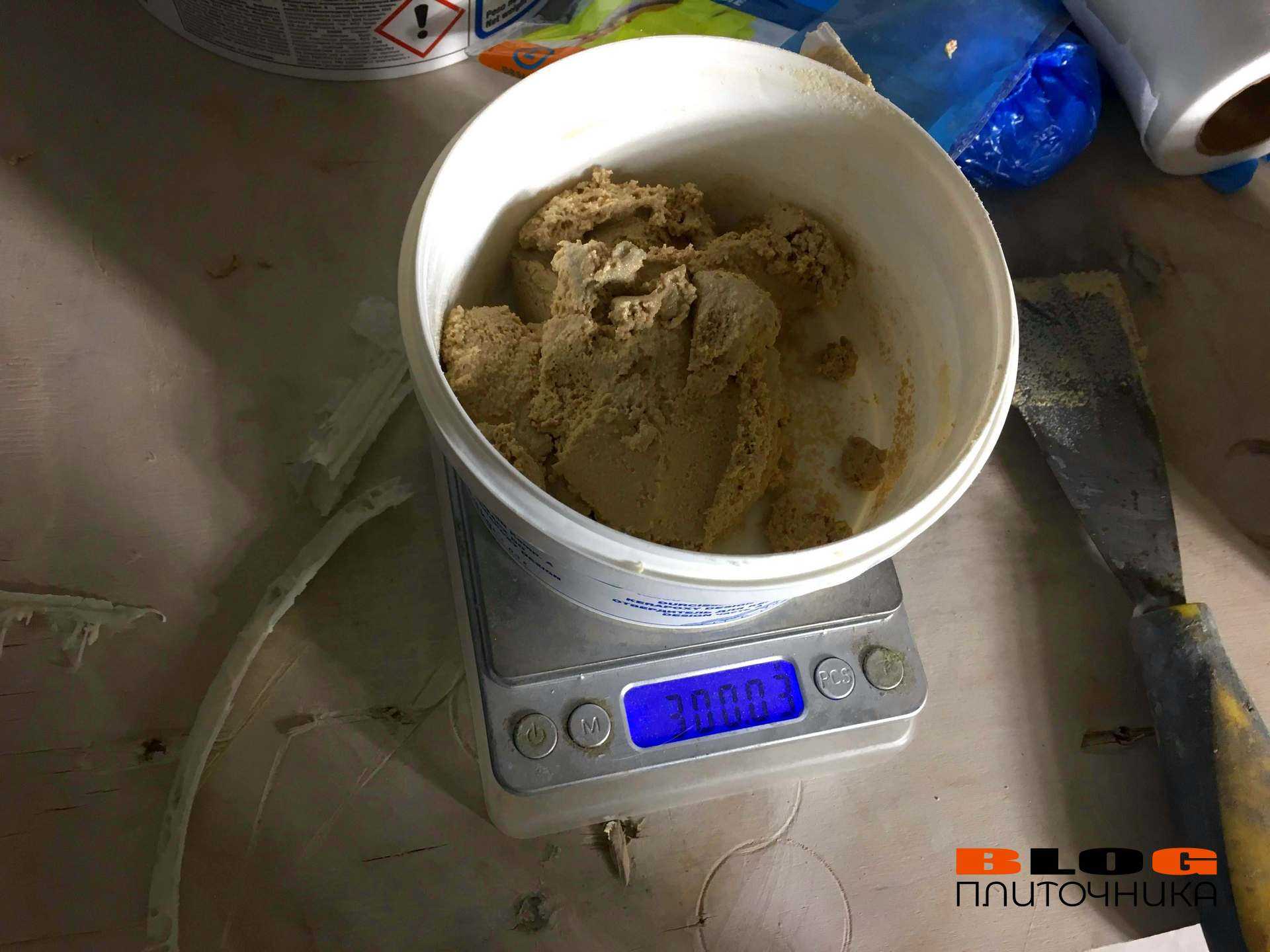 У Kerapoxy Design (ссылка ) соотношение 9:1 (у каждого бренда свой расклад, поэтому уточняйте у технологов). Если желаете быть на 100% уверенными в результате, то делать это нужно на весах. Всё чаще получаю вопросы от заказчиков из серии: а нормально, что на следующей день после заполнения швов эпоксидной затиркой швы всё ещё мягкие? Разумеется, не нормально. И это тот самый случай, где важна точность.