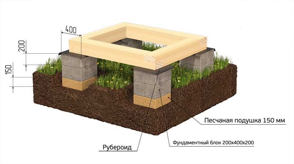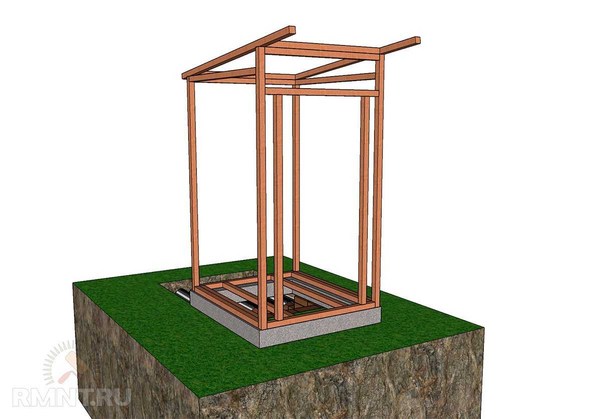 Какой бы вариант – ленточный либо свайный – не был выбран, фундамент покрывается основанием для кабинки. Для этого формируют деревянный каркас из бруса, тщательно обработанного антисептиком, в нем предусматривают отверстия, в которые в дальнейшем будут помещены шпильки. Готовый фундамент покрывают слоем рубероида, сверху ставят основание и фиксируют гайками на шпильки.