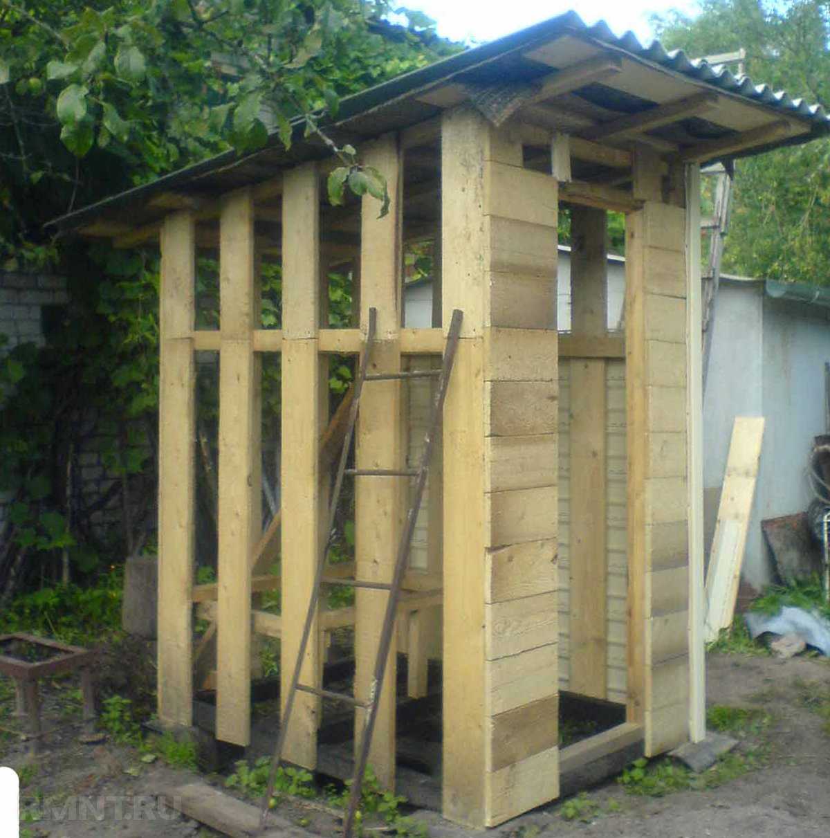 Рамки сбивают в форме прямоугольника, при этом одна из длинных сторон выступает на дополнительные 35–40 см для образования уклона кровли. Сбитые рамки поднимают вертикально и располагают параллельно друг другу на некотором расстоянии. Оно, как и высота туалета, выбирается индивидуально, но в этот габарит обязательно должна вписаться дверь с установочным блоком. Также имеет смысл определять ширину кабинки по размерам имеющегося кровельного материала, оставляя по 15–20 см на боковые свесы.