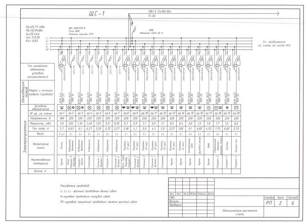 Каждый опытный электрик подтвердит, что гораздо проще приступать к работе по монтажу электрощита и проводки, имея перед глазами план помещения с указанием предполагаемого размещения бытовой техники, осветительных приборов, а также розеток и распределительных коробок. Определившись с количеством и мощностью потребителей, необходимо составить схему самого электрощитка. Однолинейная схема может выглядеть следующим образом: