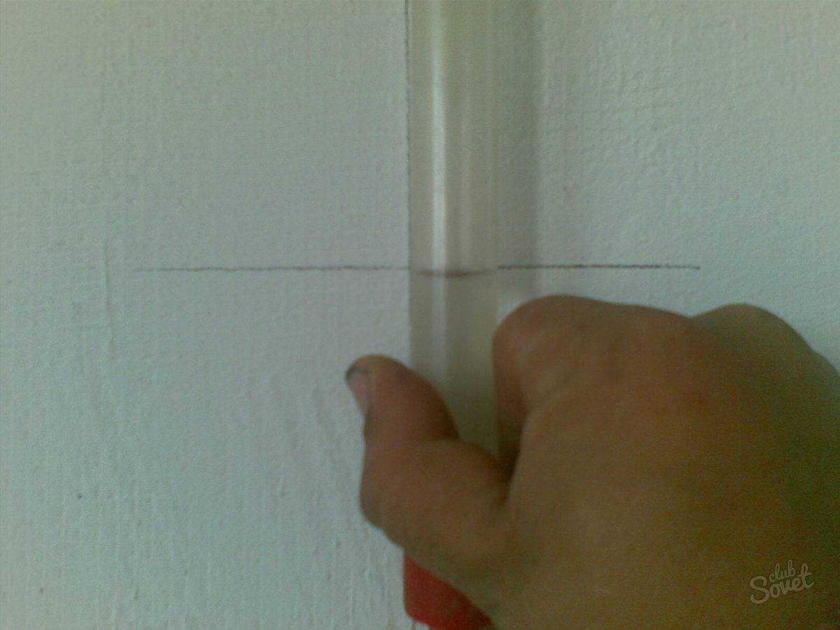 Карандашом делают отметку. Найденные точки считаются опорными. Их соединяют в прямую линейкой. Проводят перпендикулярные прямые на нужную величину, используя линейку с рулеткой. Метки соединяют. Если инструментом пользуется один человек, предварительно выполняется крепление к любой колбе. Затем фиксируется эта часть уровня к нужному месту винтами или скотчем.