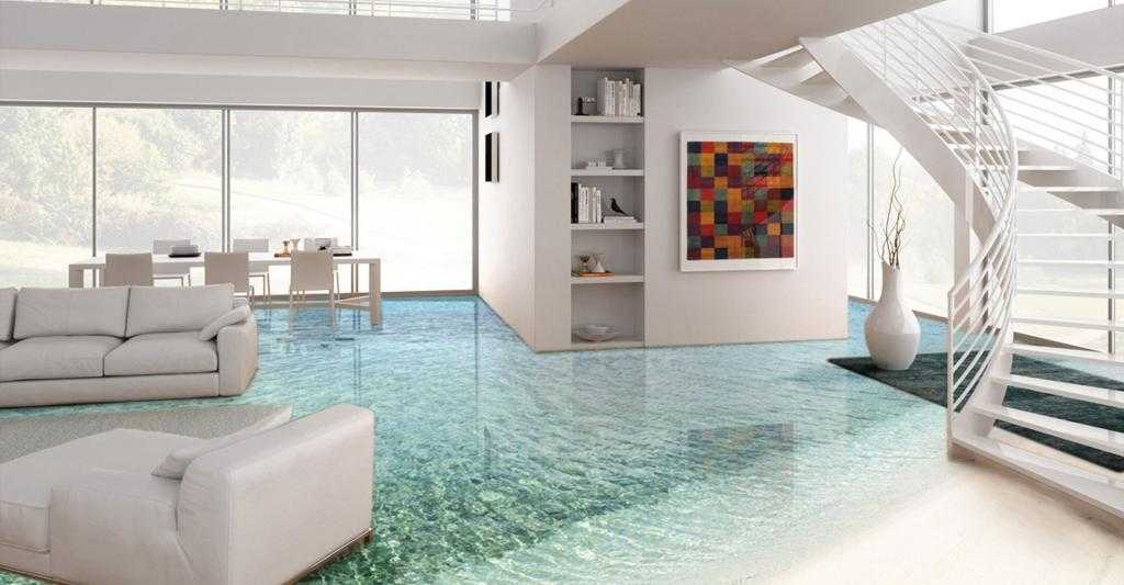 Полимер может имитировать натуральный камень или быть прозрачным, что позволяет делать подсветку и создавать объемные рисунки. На любое покрытие (включая бетонное или деревянное) кладется базовый слой полимера, затем подложка (любая фотография или рисунок), а сверху наносится прозрачный слой. В толщу пола можно вставлять наполнитель — минеральную крошку, морские раковины. Реализация таких идей повышает расход материала и увеличивает стоимость.