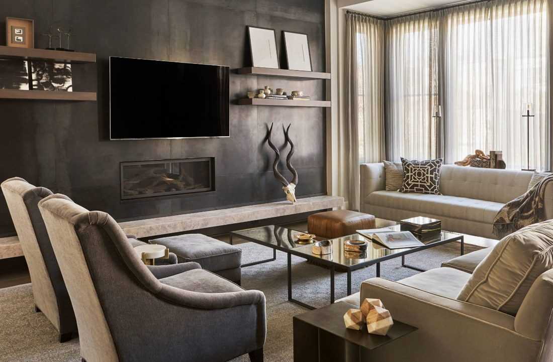 Своеобразной классикой стала лаунж-зона, которая состоит из нескольких кресел, торшера и стильного журнального столика. В некоторых случаях здесь также может быть расположен большой комфортный диван с декоративными подушками. Но всегда учитывайте параметры комнаты. Поскольку в узкой гостиной даже небольшое количество мебели может сделать камин незаметным. При желании это пространство можно дополнить небольшим пуфиком для ног или же креслом-качалкой. Независимо от выбранного варианта, рекомендуем расставлять предметы мебели не ближе, чем 1,5 м от источника огня. Это обусловлено правилами безопасности.