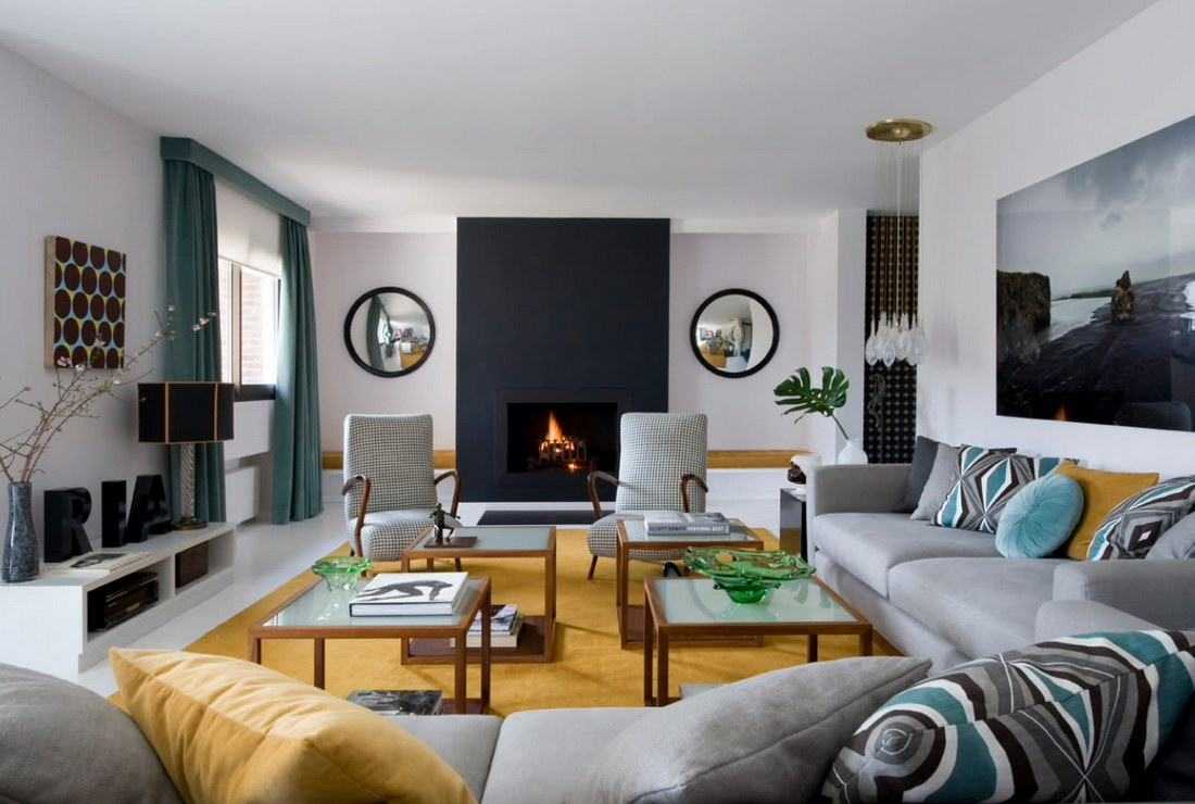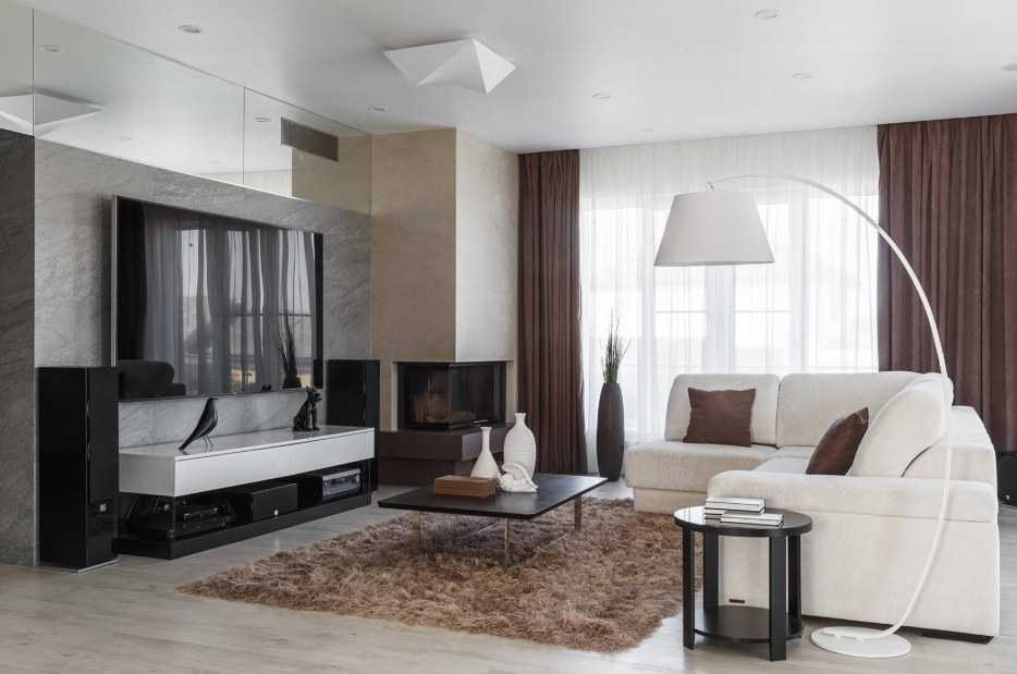 В современном мире стиль модерн в основном заключается в сочетании спокойных оттенков с контрастными тонами, а также простоте и рациональности. Кроме того, нередко в такой гостиной используется большое количество зеркал и стеклянных акцентов. Все это помогает визуально расширить пространство. Чаще всего такое оформление можно увидеть в частном доме. Ведь только в большой комнате можно установить камин по центру, тем самым сделав его главным очагом в доме. Если модерн был выбран для оформления квартиры, используйте фальш-камин. Но помните, что в таком случае топка должна быть ярко-выраженной с имитацией пламени и дров.