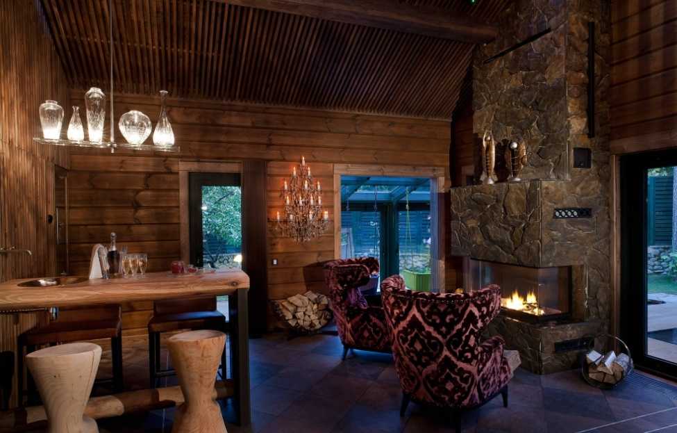 Данный стиль практически не встречается в уютных, небольших квартирах. Его преимущественно выбирают обладатели больших загородных домов. В них естественно предусмотрен массивный классический камин. Кстати в случае, если он выложен из камня, не стоит рассчитывать на ровные, гладкие линии. Что касается интерьера в целом, то гостиная должна быть оформлена со вкусом. Различные трофеи с охоты и оружие – самые распространенные декоративные детали подобных помещений.