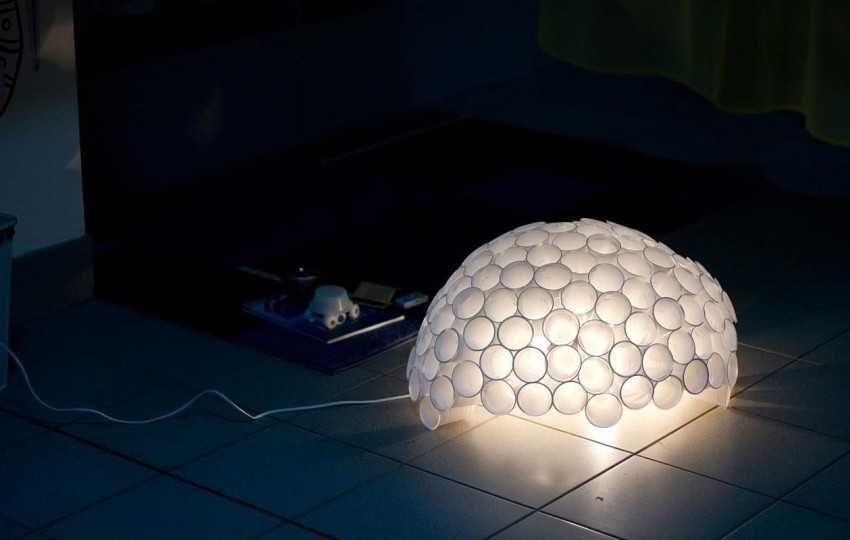 - Люстры. Поделка может также использоваться для школьных проектов. Ей можно украсить домашний интерьер, подсветить комнатное растение. Техника изготовления проста: Необходимо нарезать длинные пластины полиэтилена и склеить их между собой. Добавить патрон для лампочки, закрепить его клеем.