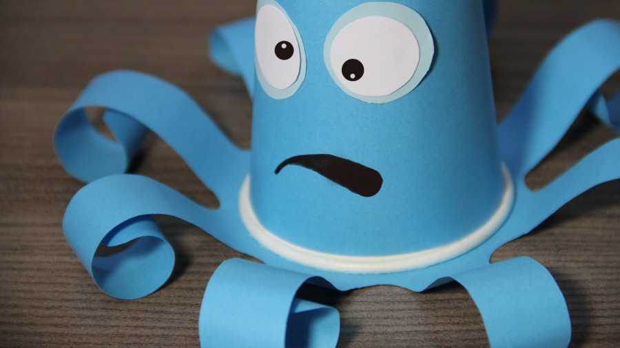 Приклейте ее ко дну стаканчика и ножницами закруглите концы щупалец.