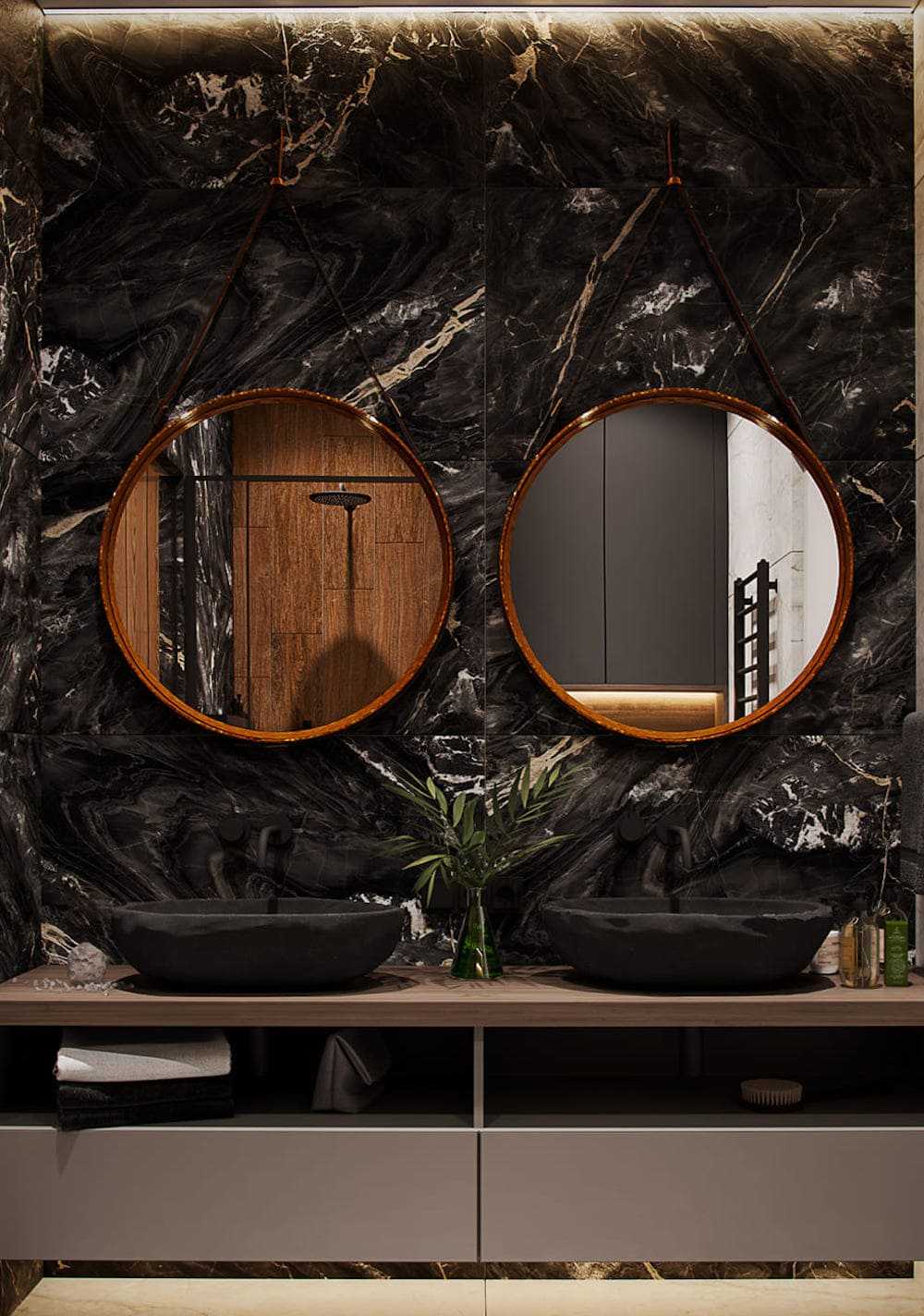 От отделки полов, до облицовки стен, мебели и аксессуаров – темно-коричневый цвет в сочетании с фактурой дерева представляет собой эффективное дополнение к любому интерьеру ванной комнаты.