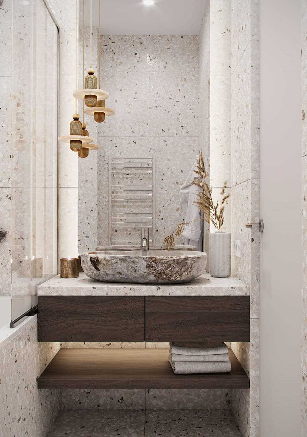 Если выбрана имитация натуральных материалов, она должна быть достоверной и качественной. Особенно это заметно на кухнях и в ванных комнатах, где столешницы из шпона заменяются прочными композитами и конгломератами, а вместо плитки и панелей появляются крупноформатные кварцевые агломераты.