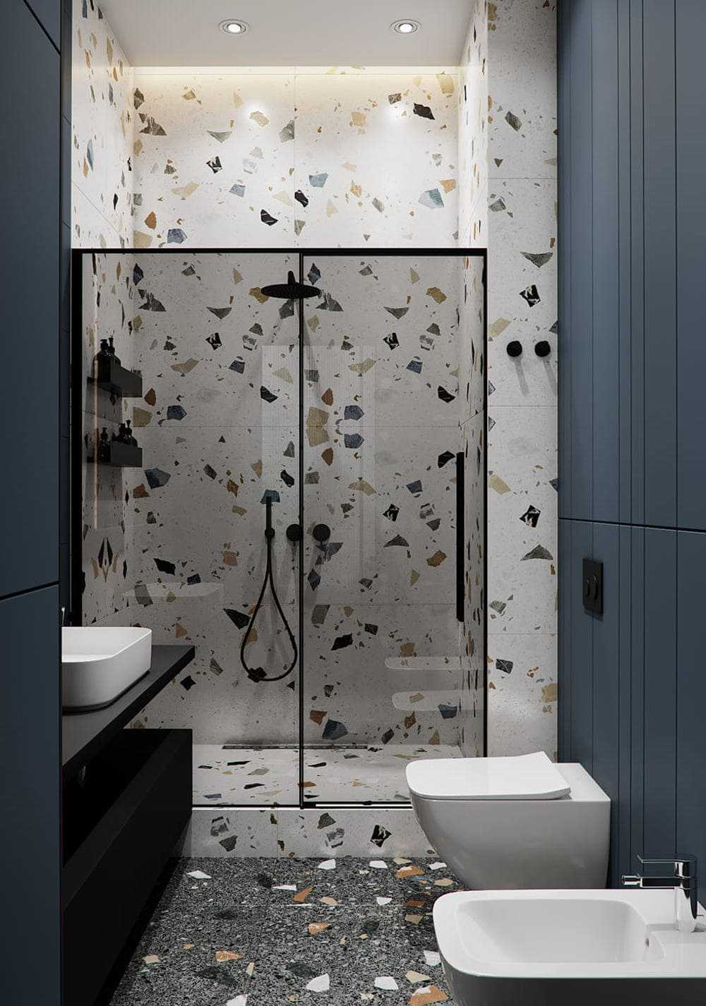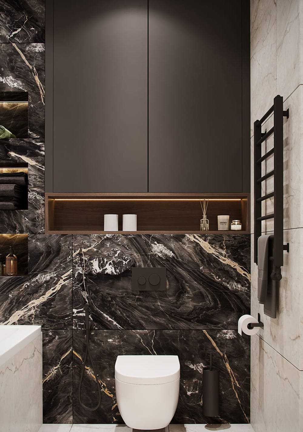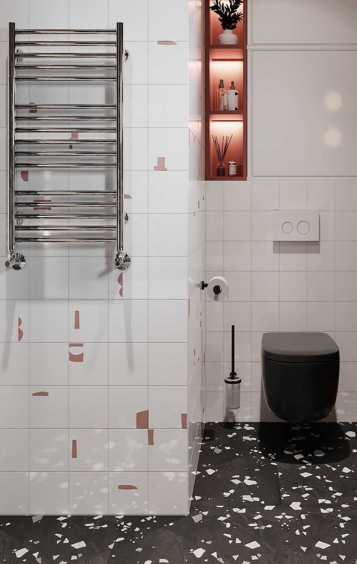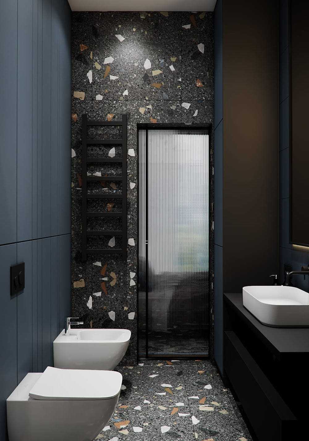 Остается актуальным сочетание угольно-черного тона с белым оттенком, но в модернизированном более современном звучании. Чаще используется черно-белая облицовка с геометрическими узорами, выполненная по мотивам марокканского стиля. Больше подходит подобное решение для просторных ванных помещений.