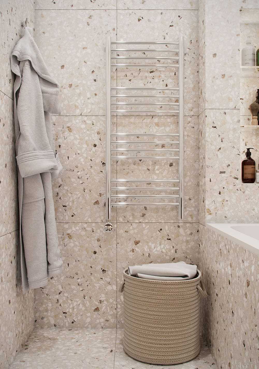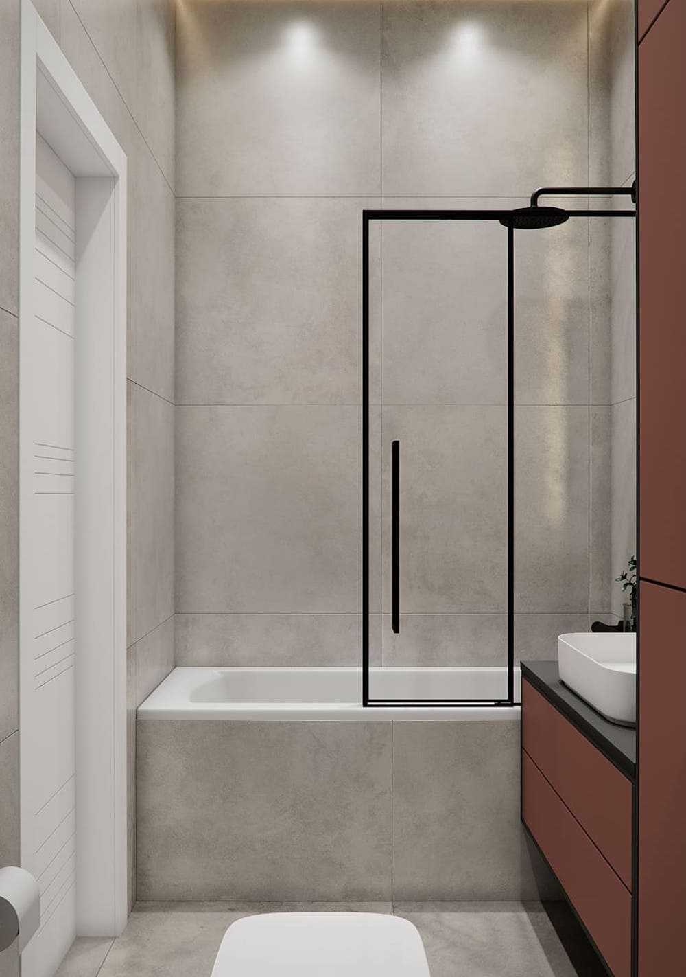 Для людей, предпочитающих стиль минимализма, идеальным вариантом будет красивая плитка с имитацией необработанного бетона. Такая ахроматическая поверхность придает небольшому объему элегантность, структурированность, ощущение уравновешенности.