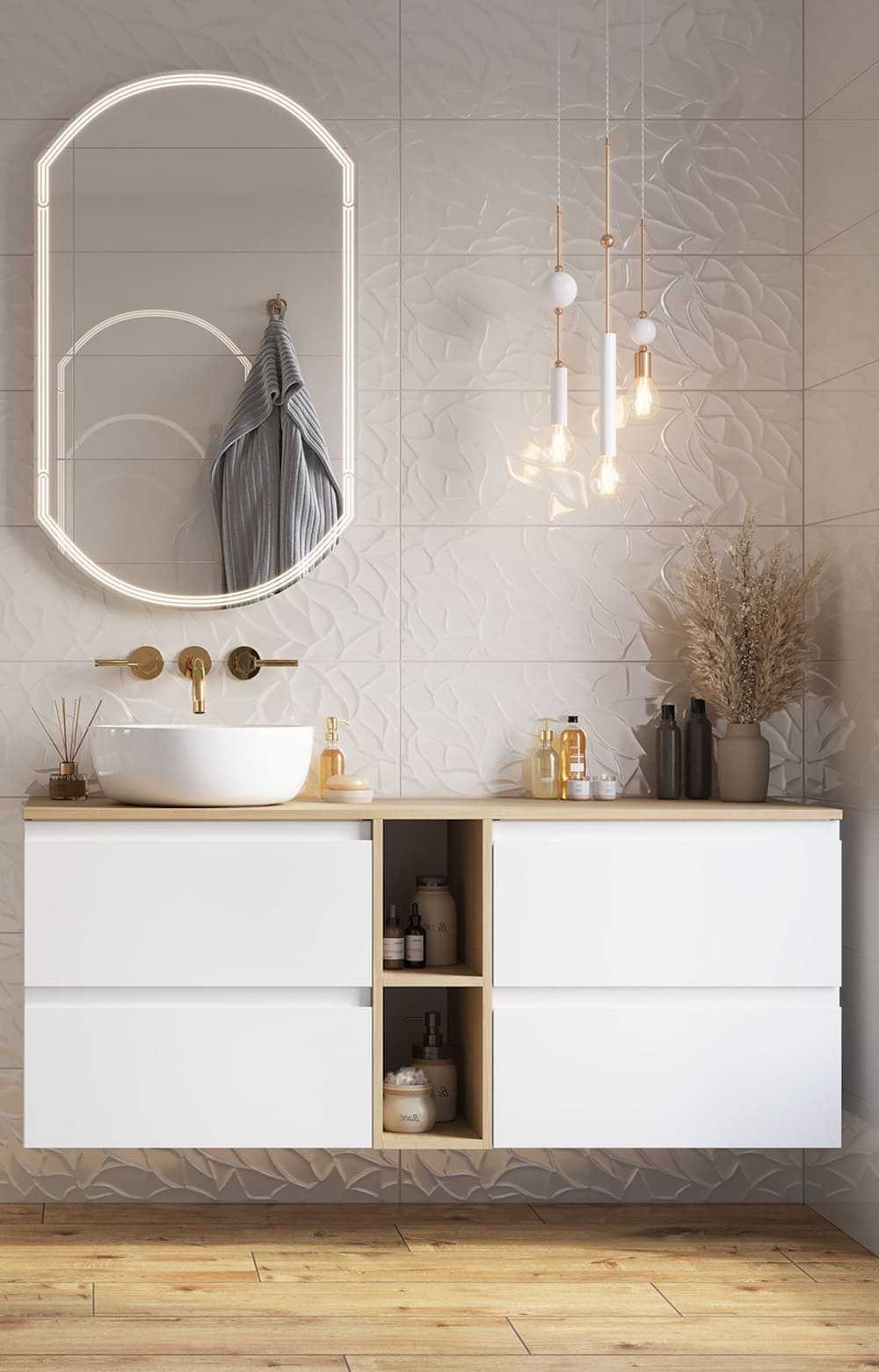 В 2021 году стоит позаботиться о правильном освещении, разнообразном и адаптированном к функциям ванной комнаты. Можно рассмотреть потолочное освещение, светодиодные ленты или светильники рядом с зеркалом.