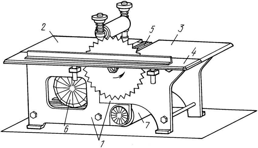 Устройство простейшего универсального станка с дисковой пилой и рейсмусом: 1 — разъемная станина; 2 — приемный подвижный стол; 3 — поддерживающий неподвижный стол; 4 — пильный стол; 5 — ножевой барабан; 6 — привод; 7 — шкурильный барабан